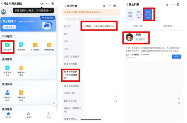 2. 点击“预约挂号”,选择“邱勇专家团队(脊柱侧弯矫形)”——“邱勇院士工作站(脊柱矫形)门诊”,选择“邱勇”,“5月25号”,进行预约挂号。