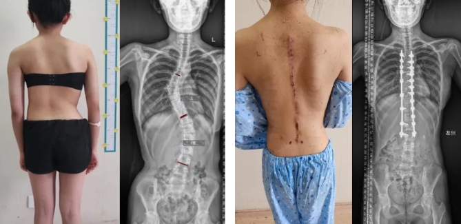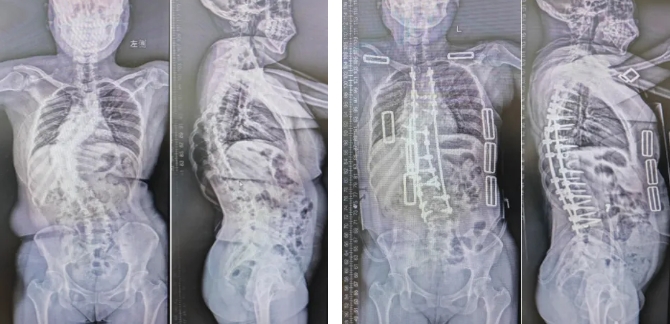 13岁的中学生小林,9岁发现特发性脊柱侧弯,初始侧弯最大角度33°,经过诊治后,小林开始佩戴支具外固定治疗,但仍未能阻止病情的进展。小林10岁时复查,发现侧弯度数仍有增大,并出现腰背部频发疼痛等症状,且侧弯度数在持续性加重。小林在家人的陪同下来到集团就诊,由邱勇院士亲自主刀进行了脊柱侧弯的矫形手术,小林术后感觉腰背痛已经明显减轻,畸形已恢复,目前随诊1年余,病情稳定,且无并发症发生。