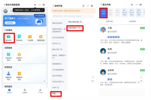 1. 关注“青岛市海慈医疗集团”官方微信公众号,登录平台预约,在菜单“预约挂号”中选择“本部及南院区预约”。