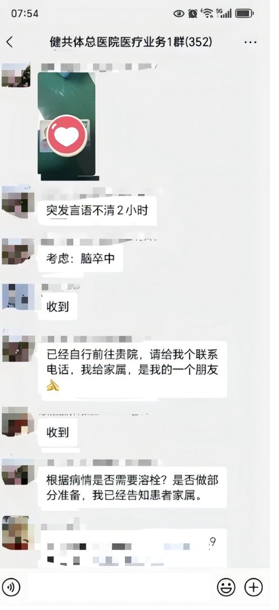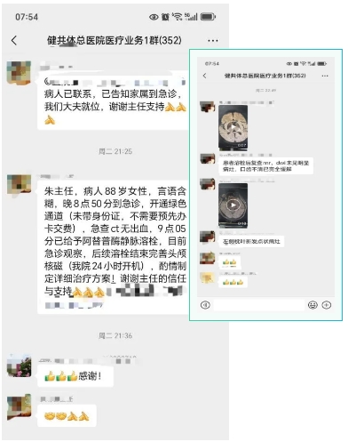 7月1日20:00,家住王台的王大娘突发言语不利,健共体总医院第五人民医院院区朱医生经过初步诊察考虑急性脑血管病,马上在双向转诊群中联系青岛西海岸新区中医医院健共体总医院牵头医院急诊科及脑病科相关人员。健共体总医院牵头医院急诊科李文治医师、脑病科张航医师均第一时间在群内相应,患者未到院,病情已跨院“云会诊”。
