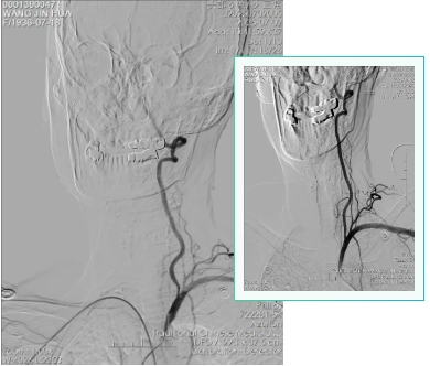 患者入院第2天,脑病科李成君主任带领介入团队为患者完善脑血管造影检查,结果示左侧椎动脉优势并起始处重度狭窄,狭窄率约80%,长度约8mm,结合颅脑磁共振枕叶梗死灶,考虑左侧椎动脉为此次卒中事件责任血管。与患者家属沟通病情、权衡获益与风险后,予经皮穿刺左侧椎动脉起始处重度狭窄球囊扩张并支架植入术,手术过程顺利。王大娘术后安返病房,继续抗板、降脂等急性脑梗死常规治疗,经积极治疗恢复良好,对治疗效果非常满意。