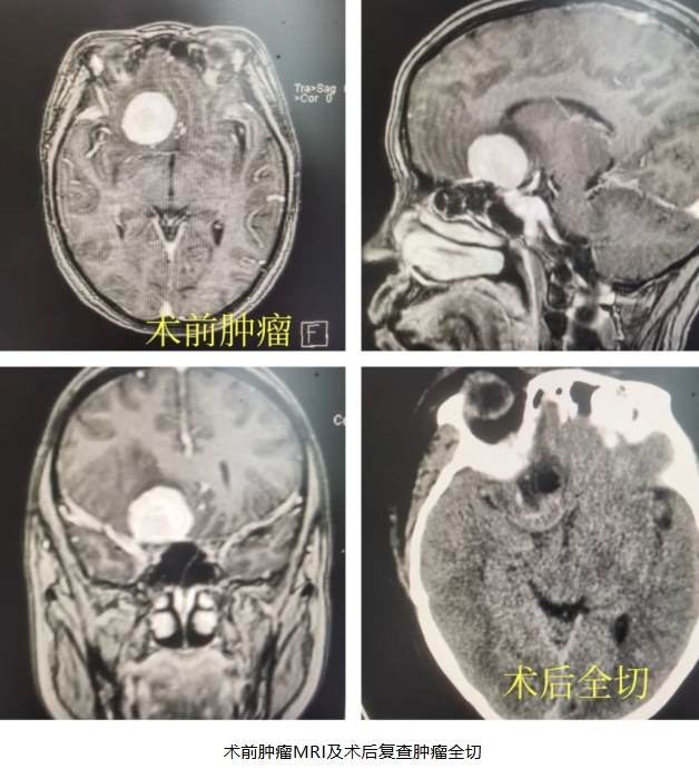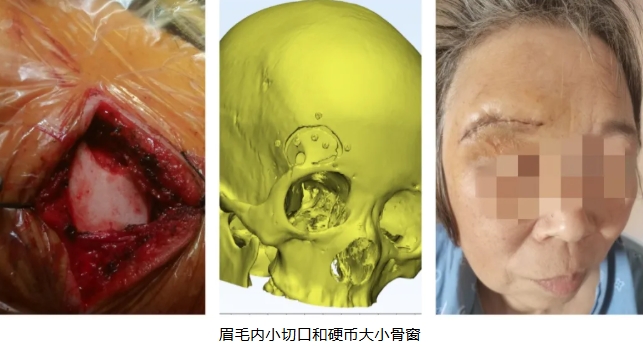 手术由孙国庆主任医师主刀。在患者的右侧眉弓处通过一个约5cm长的手术切口,然后在眉上颅骨开了一个小小的骨窗,骨瓣约2*2.5cm大小,然后在神经内镜下,运用显微外科技术及理念将肿瘤完全切除,手术出血量极小,术后恢复良好,第二天患者即可下床活动,不需要拆线,术后5天后顺利出院。术后复查见手术切口完全隐藏在眉毛内,几乎看不出疤痕。