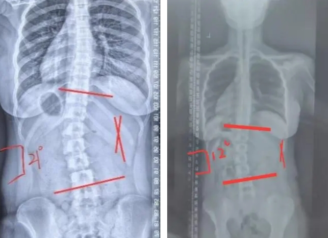 经过6个月的治疗后,小彤复查Cobb角度已降至12°,体态已基本恢复正常,疗效显著。专家团队还根据小彤的恢复情况,制定了详细的后续康复计划,重点加强姿势训练和核心肌群的锻炼,以巩固治疗效果并预防复发。