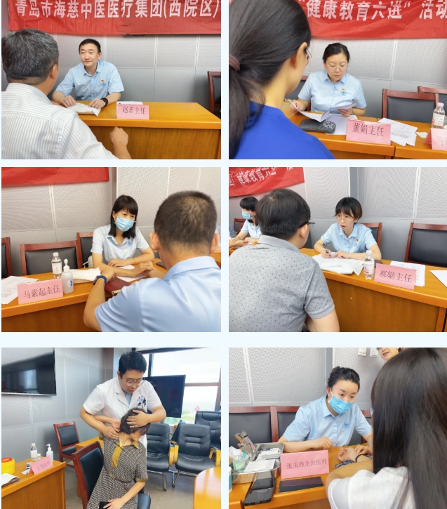为进一步弘扬中医药文化,大力开展“三伏时节话养生,中医生活进万家”主题活动,擦亮文明窗口,展示行业形象,7月23日、24日下午,青岛市海慈中医医疗集团西院区(山东青岛中西医结合医院、青岛市第五人民医院)健康公益系列活动第八站走进青岛市政府办公厅,开展健康义诊活动,将趁热打“贴”搬进繁忙的办公场地,通过专业的中医服务和中医健康指导,将“暖心医院”落到实处。