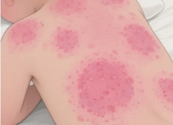 皮疹:多出现于病程4-6天,多为暗红色充血性丘疹,少数可呈出血性,通常无痒感,散在分布于躯干和四肢。皮疹可能在持续3-7天后逐渐消退,可能留下色素沉着。