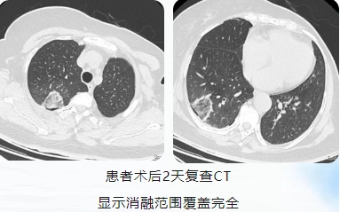 手术过程中,医生团队在局麻下经CT扫描后精确定位,将射频消融针准确穿刺至病灶核心区域。消融过程中采用50w功率分别对右肺上叶及右肺下叶病灶消融5min,CT实时扫描显示,病灶周围形成特征性的“治疗性晕征”,表明病灶已被完全覆盖消融。全程患者保持清醒状态,无明显不适感。
