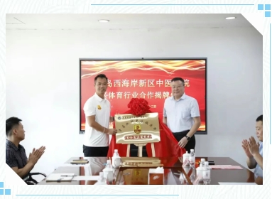 青岛西海岸新区中医医院党委书记周雷升与青岛西海岸新区教育和体育事业发展中心副主任管善勇为“青岛西海岸新区体育总会运动医学定点机构”揭牌。