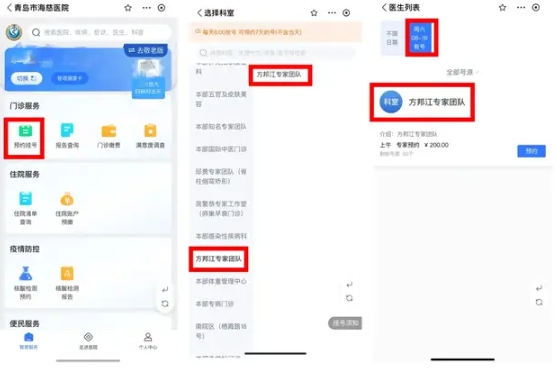 可提前关注“青岛市海慈医疗集团”官方微信公众号,或慧医APP,登录平台预约,在菜单“预约挂号”中选择“本部及南院区预约”,选择“方邦江专家团队”,提前进行预约。