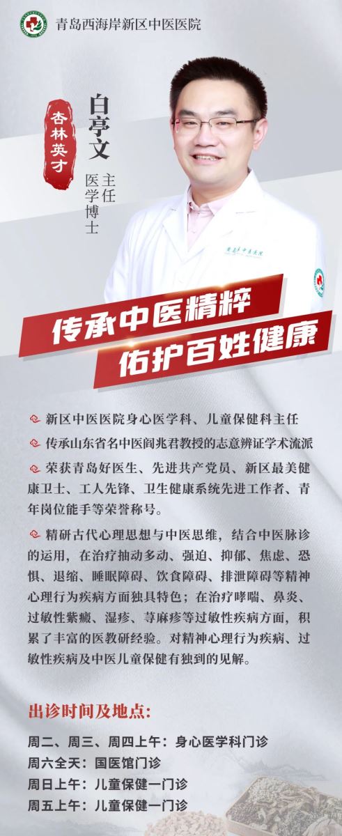 小学三年级的小明(化名)注意力不集中、不能端坐,小动作多、上课经常走神,家庭作业拖沓至深夜,情绪不稳定,急躁、易怒、冲动,家长带小明来到青岛西海岸新区中医医院身心医学科寻求白亭文主任帮助。