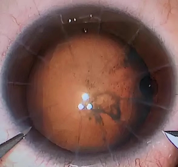 患者因高度近视,眼轴长、前房深、悬韧带松弛,眼球结构更“脆弱”。术中若眼压控制不当,可能引发悬韧带断裂、后囊膜破裂、脉络膜出血等严重并发症。团队通过术前精准用药、术中采用低灌注压+粘弹剂双重保护,配合超声乳化能量的精细化调控,全程维持前房稳定。