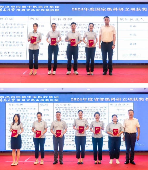 青岛市卫生健康委员会党组成员、副主任、青岛市中医药管理局副局长张充力,医院党委书记、集团总院长李兵分别为获得国家级科研立项和省部级科研立项的医师进行颁奖。