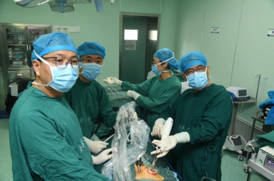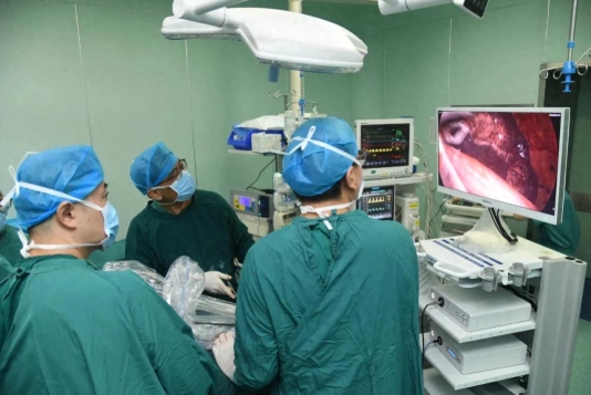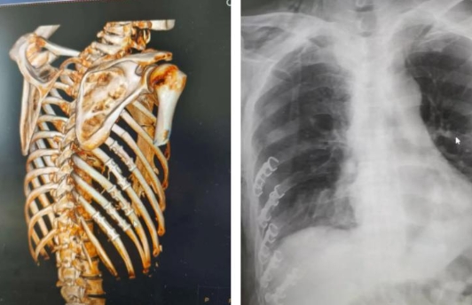 胸外科专家团队经过术前讨论一致认为,患者手术风险大,却是其重获生存之机的唯一希望。在麻醉科与ICU的大力协助下,紧密协作,在严格的手术风险评估后,经过团队的不懈努力,充分评估患者的病情后,以微创快速康复理念为原则,制定手术详细方案,讨论手术中的难点和可能出现的问题,并制定好相关应急预案。胸外科团队凭借丰富的手术经验,为患者实施胸腔镜辅助下肋骨骨折内固定术+胸腔探查止血术+肺修补术。术中清理了胸腔积血并止血,复位了插入肺组织的肋骨断端,对5根移位明显的肋骨进行了解剖型钛板内固定术,修补了肺组织损伤。