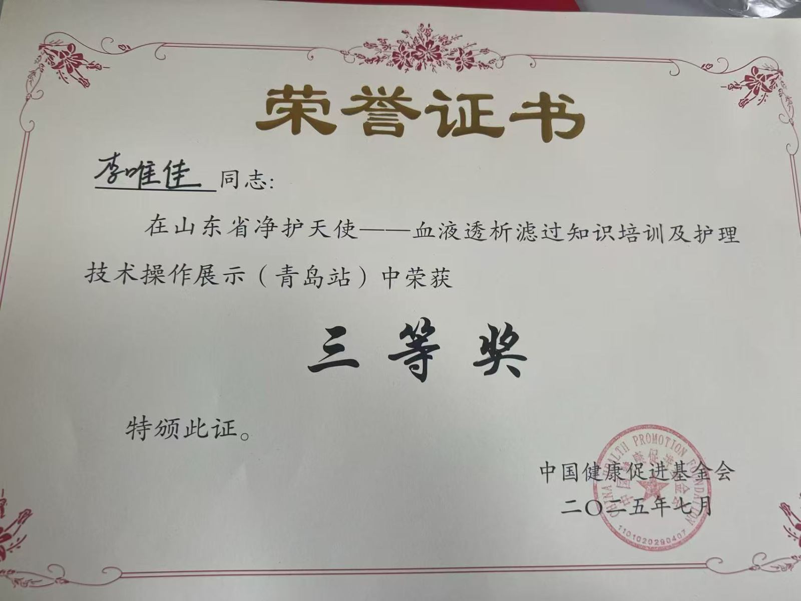 近日,在 2025 年度山东省净护天使血液滤过护理技术操作大赛(青岛站)中,平度市人民医院血液净化中心护士李唯佳历经层层选拔与激烈角逐,凭借精湛的专业技能、严谨规范的操作流程和沉着稳定的现场发挥,从众多强手中脱颖而出,成功斩获个人三等奖!