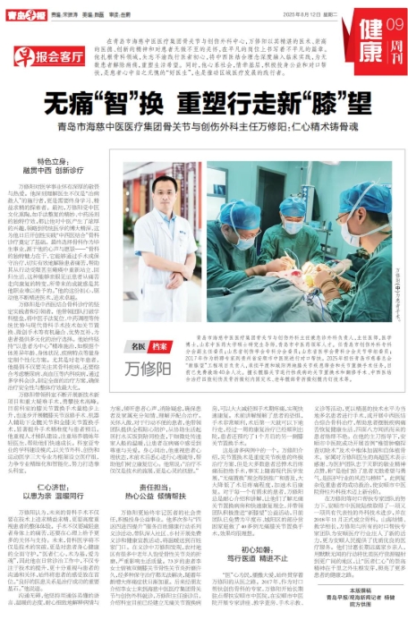 在青岛市海慈中医医疗集团骨关节与运动医学科,万修阳主任专家团队以其精湛的医术、崇高的医德、创新的精神和对患者无微不至的关怀,在平凡的岗位上书写着不平凡的篇章。他扎根骨科领域,矢志不渝践行医者初心,将中西医结合理念深度融入临床实践,为无数患者解除病痛,重塑生活希望。同时,他心系社会,情牵基层,积极投身公益和对口帮扶,是患者心中当之无愧的“好医生”,也是推动区域医疗发展的践行者。