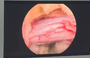 手术完成时清晰可见原本受挤压的神经根和硬膜囊完全松解,在0.8cm小切口下手术进行了约1个小时,术中出血量仅10ml。患者三天后出院。