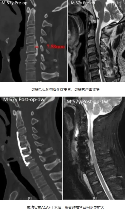 对于当下热门的ACAF术式(前路颈椎椎体骨化物复合体前移术),蒋军主任也有众多成功案例。这类手术主要适用于颈椎后纵韧带骨化症患者,传统手术切除骨化物风险高,后路手术由于属于间接减压,手术效果可能大打折扣。蒋军主任与团队专家采用国际最先进的ACAF手术方式,将骨化物连同附着椎体整体向前推移几毫米,为受压脊髓“挪出”安全通道,不仅实现脊髓直接减压,还降低脑脊液漏发生率,更好恢复颈椎生理曲度,患者术后恢复良好,四肢功能明显改善。