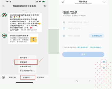 一、关注“青岛西海岸新区中医医院”微信公众号,选择“就医助手”----“便捷配药”进入小程序并根据提示绑定个人信息