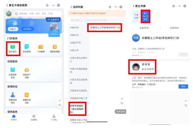 可提前关注“青岛市海慈医疗集团”官方微信公众号,或慧医APP,登录平台预约,在菜单“预约挂号”中选择“本部及南院区预约”,选择“邱勇专家团队(脊柱侧弯矫形)”——“邱勇院士工作站(脊柱矫形)门诊”,提前进行预约。