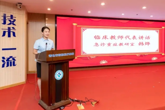 青年教师代表韩烨上台发言,分享了在“医教融合”中的实践感悟与育人初心,表达了将继续坚守教学岗位、深耕医学教育的决心,引发在场师生的强烈共鸣。