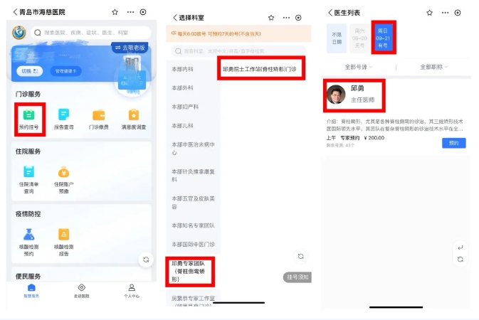 1. 官方公众号预约:关注 “青岛市海慈医疗集团” 官方微信公众号,进入 “预约挂号” 板块,选择 “本部预约”—“邱勇院士工作站(脊柱矫形)门诊”,选择 9 月 21 日就诊日期,按提示完成预约;