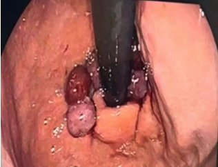 比如食管裂孔疝,一种部分胃经膈食管裂孔进入胸腔的疾病,可引起胃食管反流并降低食管对胃酸的清除。胃镜倒镜观察可见疝囊。