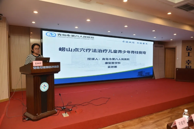 青岛市第八人民医院康复医学科袁琳娜主任介绍《崂山点穴技术治疗儿童青少年脊柱侧弯临床应用及现场演示》,针对脊柱侧弯相关肌群的定位与手法进行示范,展现青岛中医药干预独特优势。
