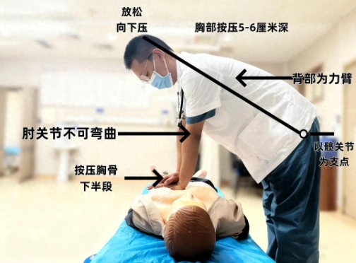 按压方法:双手重叠,十指交叉紧扣,手掌根部着力,手臂垂直用力向下按压。