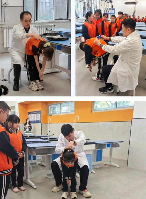 于沛林、罗学勤、柴永利三位筛查专家在实验室为学生们逐一进行脊柱侧弯筛查。筛查中,脊柱外科专家们通过目测法、Adams前屈试验和躯干旋转角测量等方式,为每位学生进行脊柱检查,详细记录学生体态等相关健康信息。对于脊柱侧弯初筛判断为阳性者,学校会及时将筛查结果告知家长,建议到脊柱外科门诊进行进一步检查,明确是否存在脊柱侧弯,根据检查进行个体化的干预治疗。