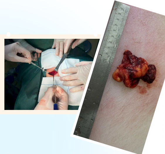 最终,一枚约5cm的纤维脂肪瘤被完整取出——标本呈不规则形态,表面暗红(包膜及血运组织)与黄色(脂肪核心)交织,直尺测量长径约5cm,与术前影像评估高度一致。切缘干净,无残留!病理回报确认良性,手术圆满成功。