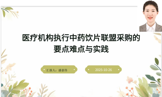 青岛西海岸新区中医医院主管中药师潘嘉伟则聚焦《医疗机构执行中药饮片联盟采购的要点难点与实践》,结合新区案例拆解实操细节。她分析了中药饮片联盟采购的背景与意义,强调报量要精准,验收时要对照“集采备案样品”严格把关,并分享医院要求供货商“囤够一季度用量”的保供方案,解决“断供焦虑”。