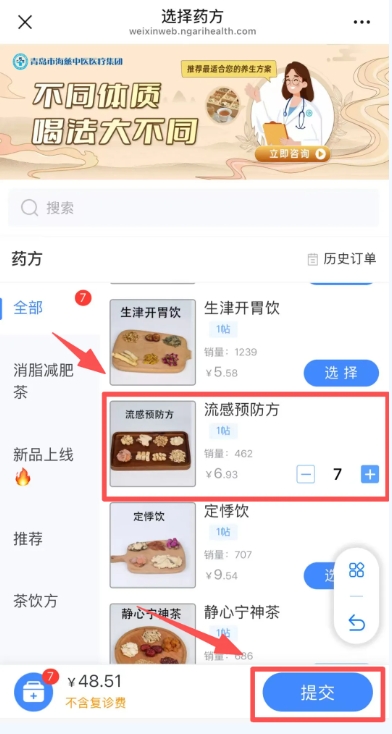 您只需动动手指,在 [青岛市海慈医疗集团]公众号开方,您的专属养生茶饮即可快递到家。自11月3日起,同时增加线下自取服务。