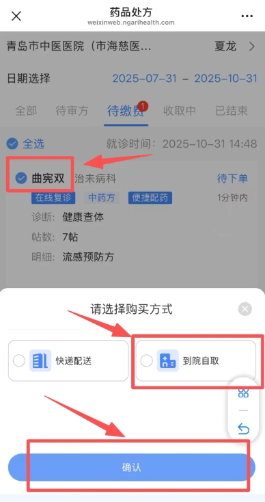 6.点击支付,支付后等待医院准备药品,准备好后到自取点取药。