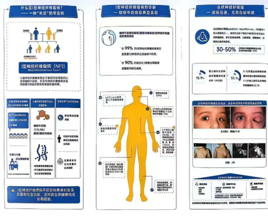 Ⅰ型神经纤维瘤病患者可出现脊柱侧弯等骨骼异常,并可能伴有身材矮小等生长发育迟缓表现。多数患儿伴有不同程度的认知或学习障碍,对其成长和生活质量造成显著影响。