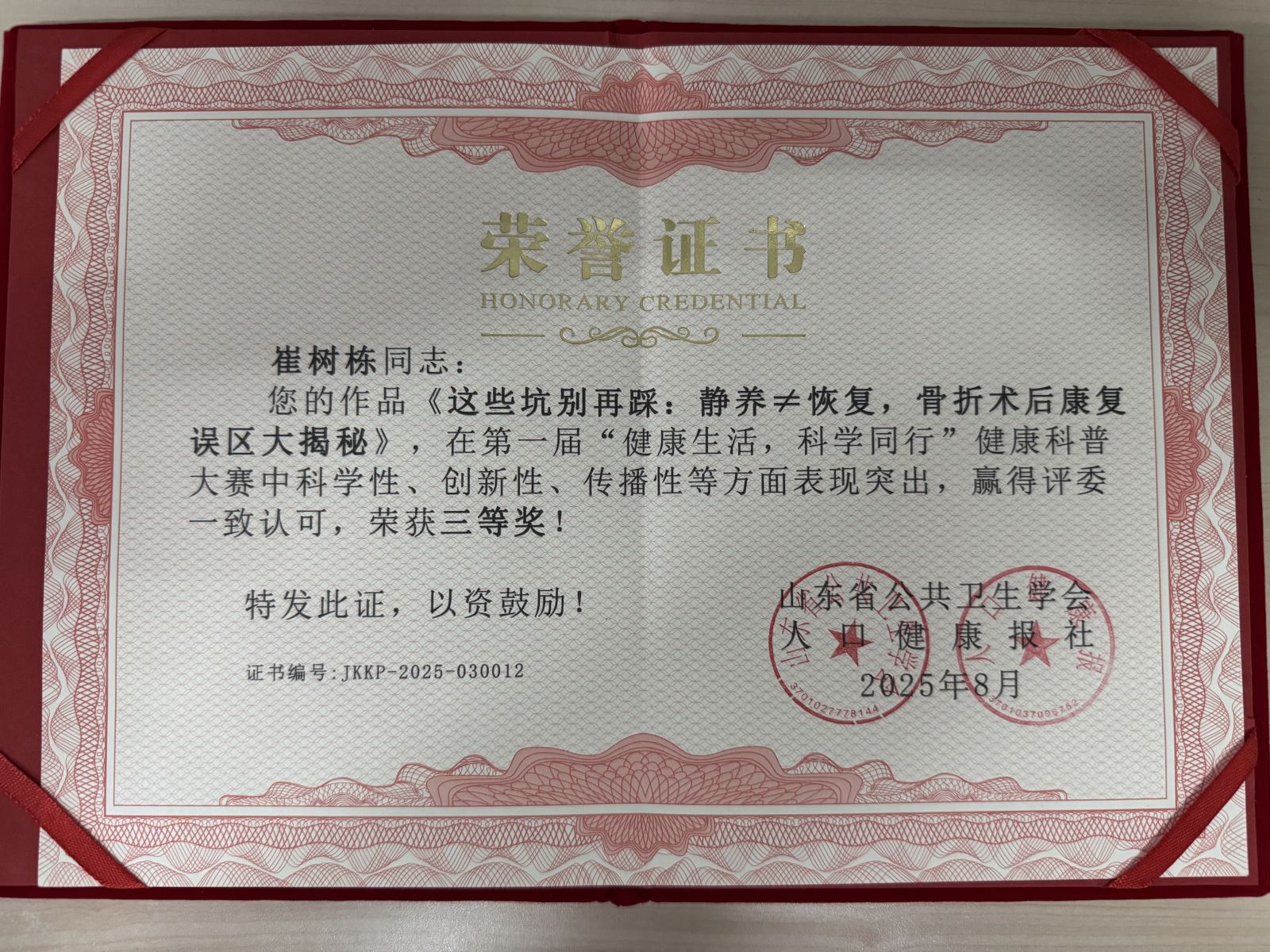 为了进一步提升全省医学科技工作者健康科普的意识,促进全民健康科学知识普及,根据山东省《2025年度山东省职工“聚力强省建设,建功高质量发展”创新创优竞赛项目的通知》(鲁会【2025】15号)。近期,在山东省医学会、省医务工会联合举办的“健康生活,科学同行”第二届医学科普创作大赛中,平度市人民医院康复医学科主治医师崔树栋提报的作品《骨折术后康复误区大揭秘:静养≠恢复,这些坑别再踩》斩获三等奖并在省级报刊《人口健康报》上刊登。