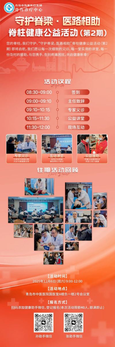 现场将详细解读“百例骨科疑难病例征集公益援助”活动政策,符合征集条件的患者可申请援助,由青岛市微尘公益基金会提供部分治疗费用,切实缓解就医负担。