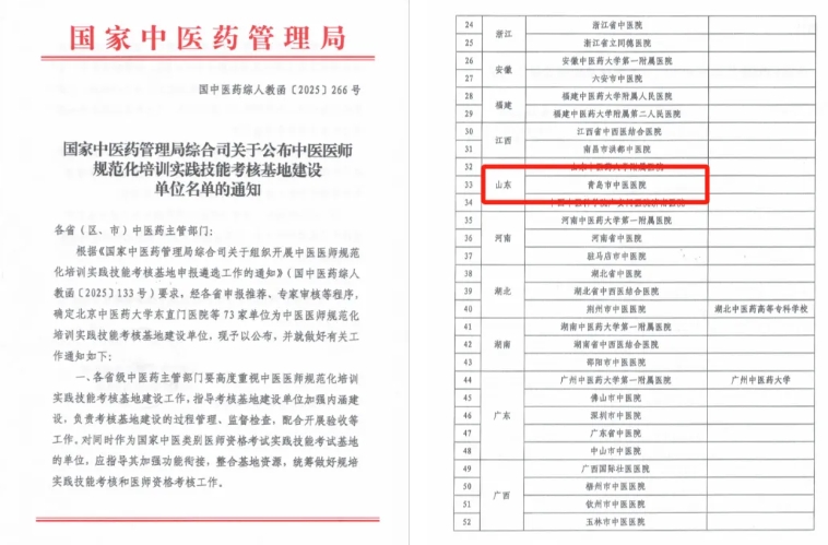 近日,国家中医药管理局综合司公布中医医师规范化培训实践技能考核基地名单,青岛市中医医院凭借在中医医疗、教学、科研等领域的深厚积淀与突出实力,成功跻身全国73家建设单位行列,成为山东省三家获批单位之一。这标志着我院中医医师规范化培训工作的综合实力与行业影响力获得国家权威认可,为医院临床教学高质量发展掀开了崭新篇章。