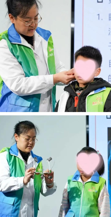 讲课过程中,袁医生与孩子及家长互动热烈,现场为参与讲座的儿童开展耳穴压豆实操教学,手把手指导穴位定位与按压方法,让大家直观掌握实用防控技巧。