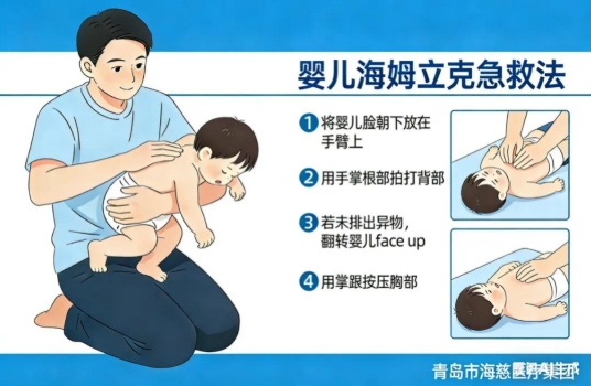 2.婴儿(1岁以下):将婴儿面朝下置于前臂,头部低于身体,掌根拍打肩胛骨中间5次,若异物未排出,转为面朝上,掌根按压胸骨下半段5次,交替操作直至异物排出。