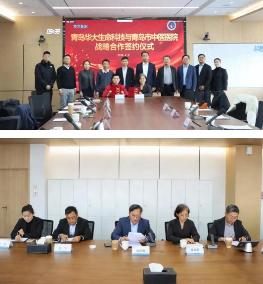 2月3日上午,青岛市中医医院与青岛华大生命科技有限公司战略合作签约仪式在华大北方中心隆重举行。本次签约仪式汇聚了政、产、学、研、医多方力量。青岛市卫生健康委员会党组成员、副主任、青岛市中医药管理局副局长张充力,青岛市科学技术局副局长邢军出席仪式并致辞。青岛市中医医院党委书记、集团总院长李兵,党委副书记、院长、集团常务副总院长孙金芳,党委委员、副院长范传波;华大集团山东公司总经理、华大研究院领域首席科学家范广益,青岛华大基因研究院院长黎瀚博等双方领导班子及核心团队成员共同见证了这一历史时刻。