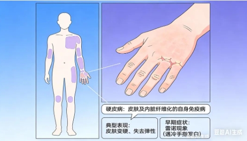 硬皮病,又称为“系统性硬化症”,是一种罕见的全身性自身免疫性疾病,2018年5月国家卫健委将其纳入第一批罕见病目录。其临床表现以皮肤增厚和纤维化为特征,除了影响皮肤,还可能累及消化道、肺、心脏和肾等内脏器官。此病在女性中更为常见,发病年龄多在20-50岁之间。硬皮病的病因尚不明确,目前认为硬皮病是遗传和环境等多种因素共同作用下发生的自身免疫紊乱,进而导致血管病变、胶原沉积及纤维化等。