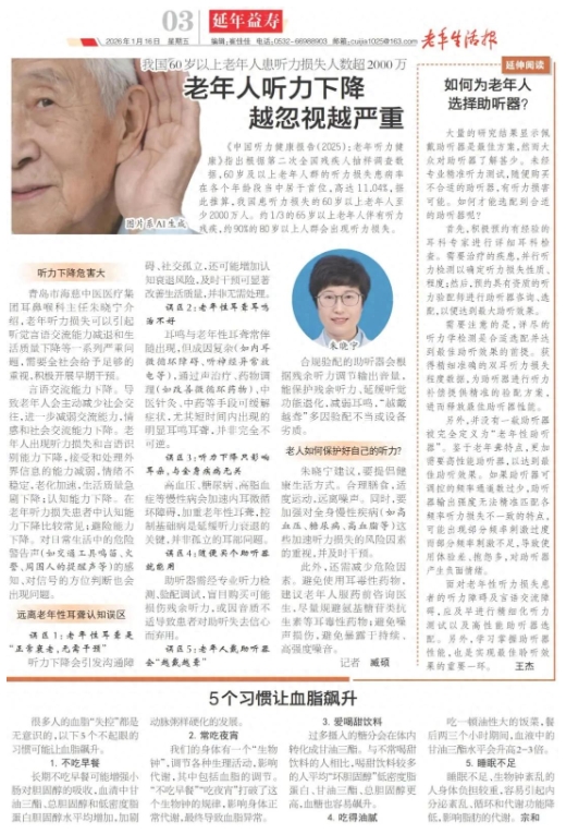 青岛市海慈中医医疗集团耳鼻喉科主任朱晓宁介绍,老年听力损失可以引起听觉言语交流能力减退和生活质量下降等一系列严重问题,需要全社会给予足够的重视,积极开展早期干预。