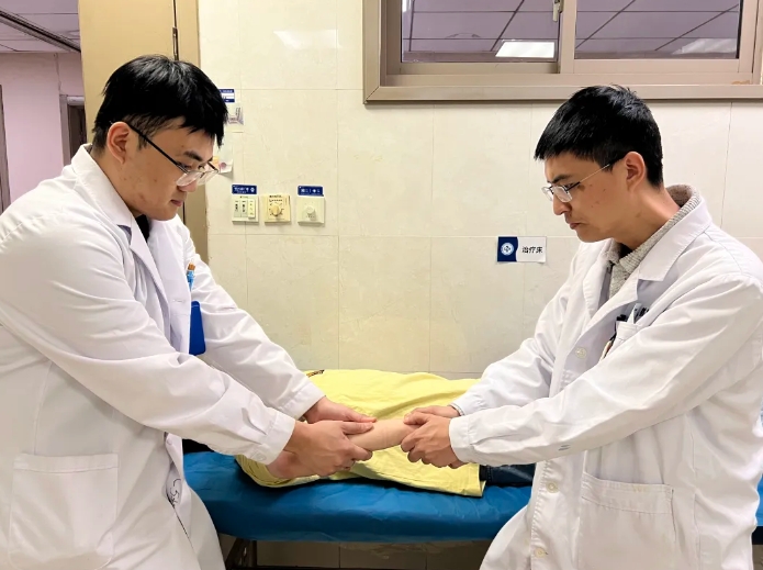 62岁的孙女士因外伤导致右腕关节疼痛、活动受限,经检查确诊为“右桡骨远端骨折”。患者非常惧怕手术,强烈要求保守治疗,骨科医生团队经充分评估患者符合中医治疗条件,为患者量身打造中医特色治疗方案,严格遵循桡骨远端骨折中医临床路径标准,为患者实施“骨折手法整复 + 小夹板外固定”治疗,同时结合中医辨证开具中药汤剂口服,配合中药涂擦等中医特色理疗。住院期间,医护人员每日指导患者进行功能锻炼与康复训练,定期调整夹板松紧度和加压角度,全程精细化诊疗。经复查,孙女士右腕关节骨折端对位对线良好,掌倾角恢复正常,顺利治愈出院。