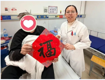 经过数十个小时的连续奋战,患者的血糖逐渐下降,酸中毒好转,意识慢慢恢复清醒。张有涛主任与其母亲取得联系,耐心详尽的解释病情,“大姨,我们是三甲中医院内分泌科,尽我们努力做好各方面工作,有什么需求直接找我们就行。”“大姨您好,我们正在查房看您儿子,他已经转危为安了,自己能吃饭了,您放心吧!”张有涛主任用一句句温暖而有力的话语安抚母亲的情绪。除夕,吴晓青副主任为患者送上了张有涛主任亲手写的“福”字,为他们送去新年祝福,除夕夜医院食堂免费提供水饺,让患者感受到“家”的温暖。