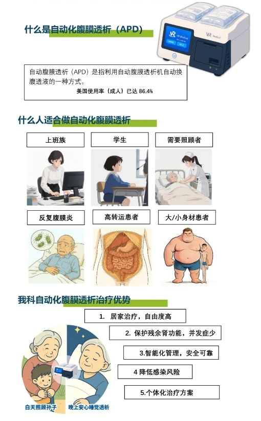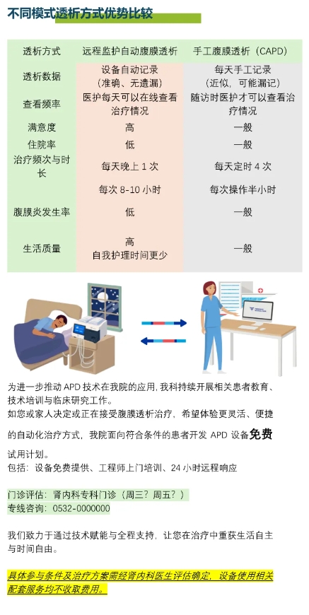为进一步推动APD技术在我院的应用,科室持续开展相关患者教育、技术培训与临床研究工作。如您或家人决定或正在接受腹膜透析治疗,希望体验更灵活、便捷的自动化治疗方式,我院面向符合条件的患者开发APD设备免费试用计划。包括:设备免费提供、工程师上门培训、24小时远程响应。具体参与条件及治疗方案需经肾病科医生评估确定,设备使用相关配套服务均不收取费用。我们致力于通过技术赋能与全程支持,让您在治疗中重获生活自主与时间自由。