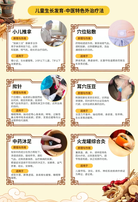 矮小症的治疗,并非只有“打针”或“吃中药”单一选项。专科同步开展多项中医特色外治技术,如小儿推拿、穴位贴敷、中药沐足、耳穴压豆、火龙罐等,通过刺激经络与穴位,调和气血、温补脾肾助长。