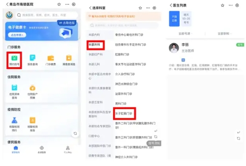 •微信预约:关注青岛市海慈医疗集团微信公众号,点击 “预约挂号”→“女子肛肠门诊”